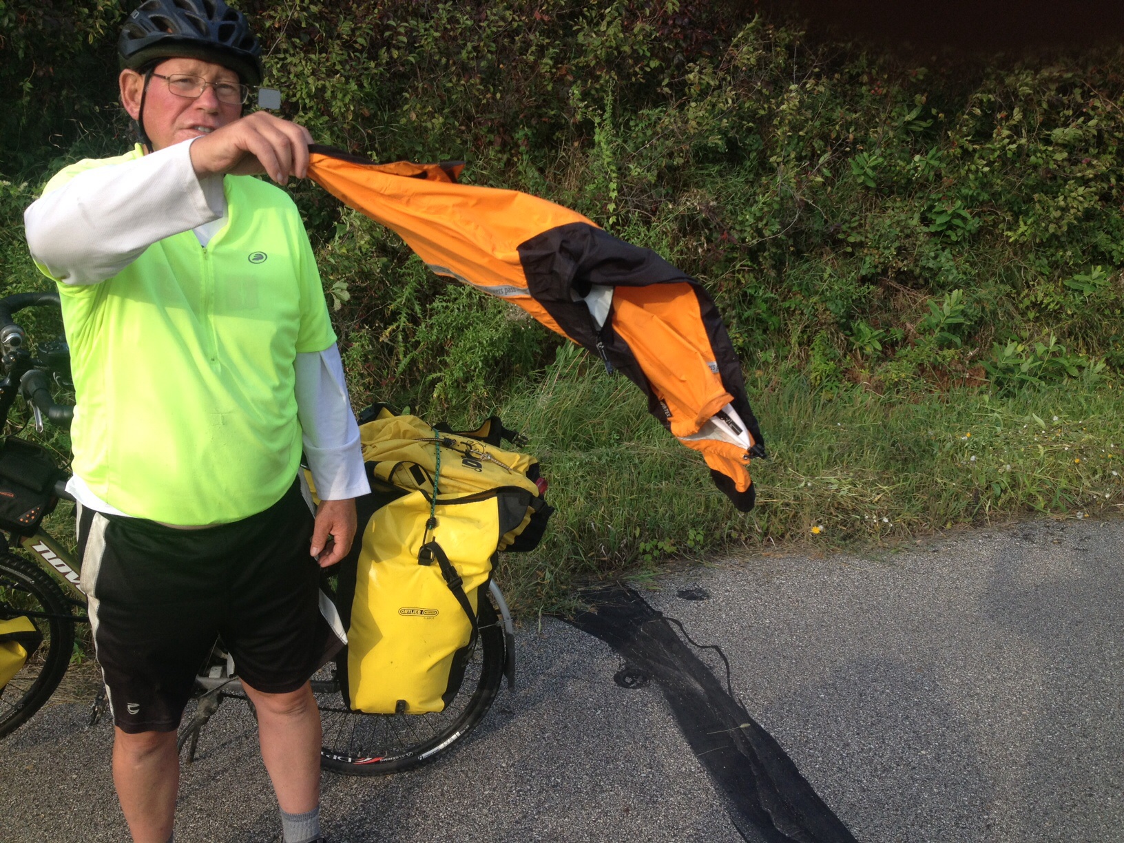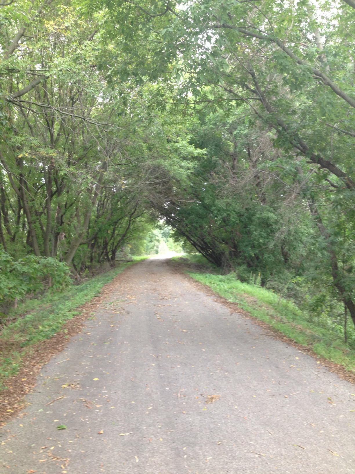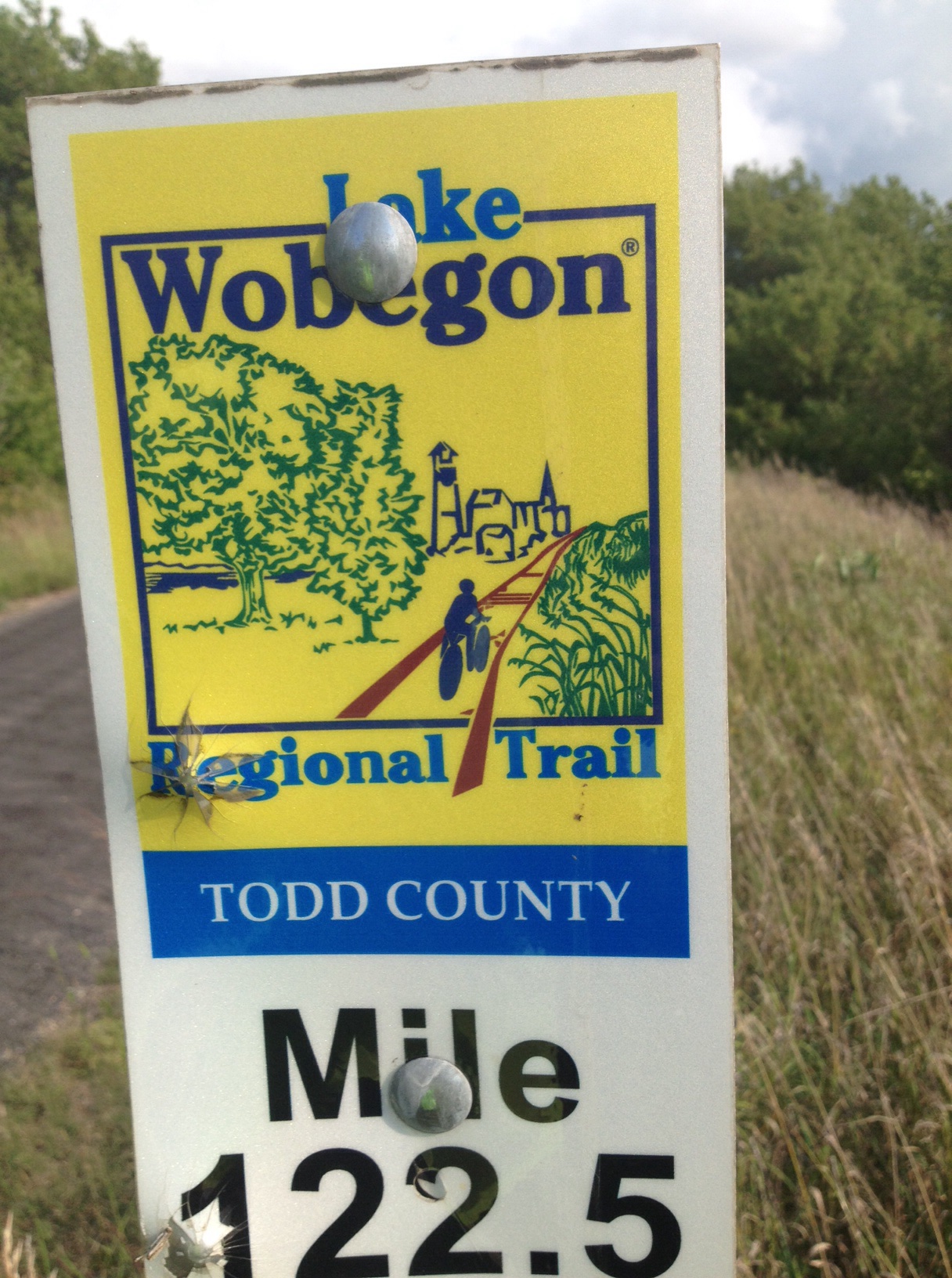 image image imageToday we rode all day, 70 miles on the Wobegon trail. It is an old railroad track that was cleaned up and paved. No motor vehicles allowed. You can see from the picture that it was very pretty. Went along a lot of lakes and farms. It was nice because we didn’t have to worry about cars and trucks. The only thing that wasn’t perfect today was the wind. We had a 13 to18 mph head wind all morning. You can see in the picture with my coat being blown sideways. We had to pedal like a dog to go 6 or 7 mph. Really made for a long day.  According to the weather report we were supposed to get rained on today, but the thunder storms all seemed to miss us. We get to ride on the trail for about half the day tomorrow and the weather report says 5 mph winds at our backs! Whooooeeeee that will be nice! We are camping at the city park in Sauk Center, Minnesota. Funny name for a town. This morning when we were fighting the wind I was calling the town Suck Center in honor of my motto for the trip adopted from the book on training Navy Seals. “Enjoy the suck”, the suck being when you are gasping for breath, your tongue is hanging out and you keep going. This campground had a shower and it felt so good. I looked in the mirror when I went in to shower and I had salt crystals all over me. I must have sweated a lot. Tomorrow we are going 90 miles, but it should be an easier day if the weatherman is right, hoping so.