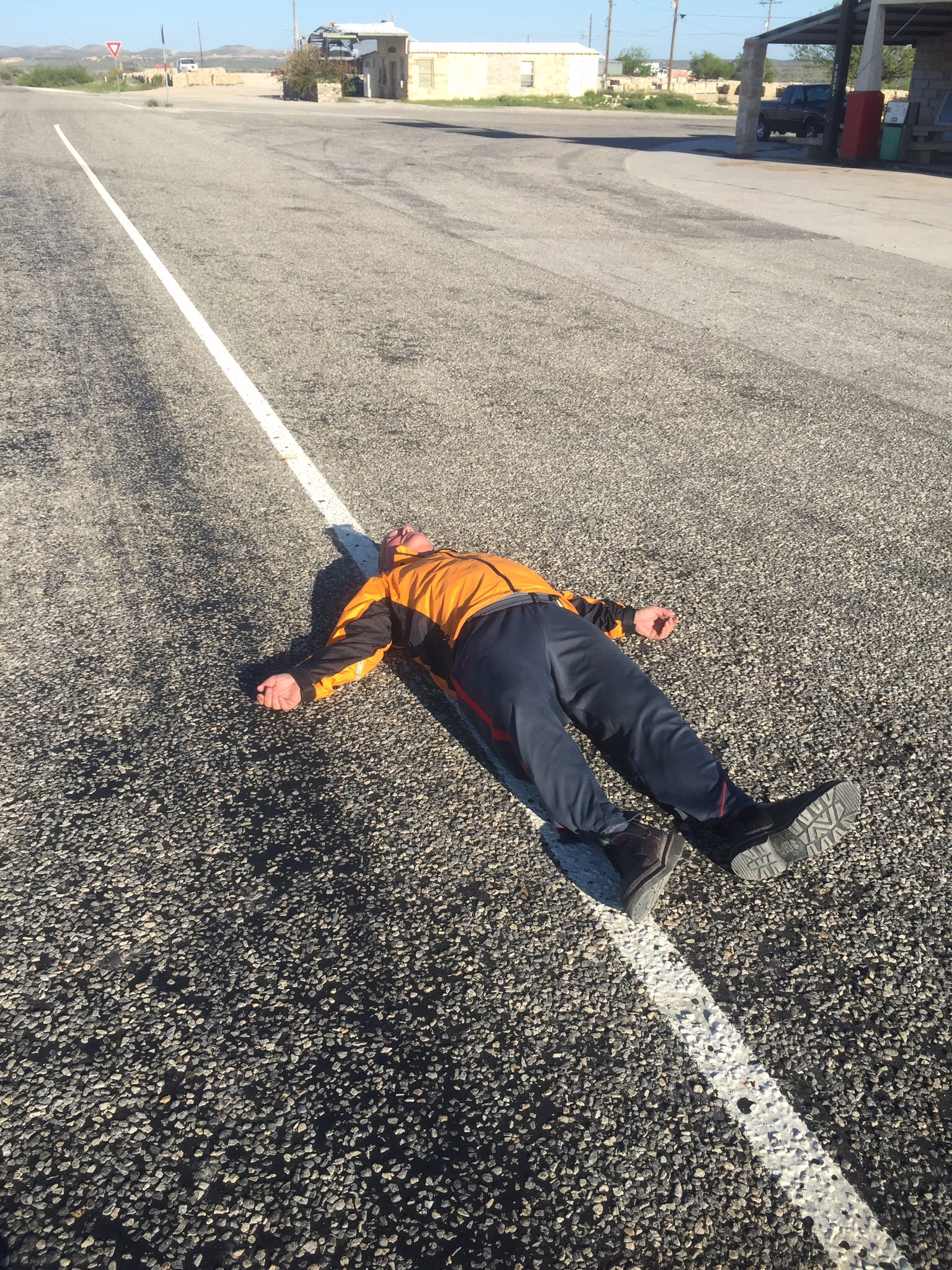 That is me laying on the road dead because of the brutal day of riding with a 15 to 20 mph headwind with gusts to 30. I am not really dead, but you knew that, I just feel like I am dead! Steep hills have a top and then you go down, but the wind just doesn’t quit. I think it is as much psychological as physical. The seemingly never ending battle to make progress just wears you out physically and mentally. But we finally made it and arrived at a Motel that had no electricity or hot water, but they finally got some electricity but no hot water, handi-wipes tonight. There was no camping spot so we rented one room and the Camper and trailer are in the parking lot where John and Mary Anne, and Richard and Mary will sleep. Patty and I get the room with everybody using the bathroom in our room. Marjorie, our adopted tag along is going to sleep in the back seat of the pickup. We rode 60 miles today, and the weather forecast for tomorrow is for more of the same on wind so we are going to go 50 miles, and the following day we have some super steep hills as well as wind so we are going to go 40. We are having an awesome time😀
