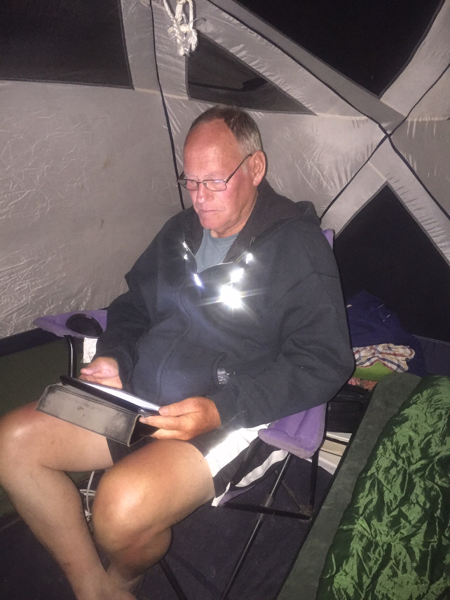 Each evening we pedal into camp usually between 3 and 7 pm depending on miles, hills, wind, and flat tires. The ladies usually leave in the morning around 10 am after packing everything up, and get to our next camping spot before we do and have everything all set up by the time we arrive. For Patty that means setting up our tent, blowing up air mattresses, unrolling sleeping bags, and cooking dinner on our two burner propane camping stove. When we pull in usually the first thing I do is take a shower and get out of my sweaty biking cloths. I hang those all over my bike to air out and dry for another day of riding. We all eat dinner together and talk about the day and plan the next day. Mary Ann usually does all the calling and arranging for the next two or three days camping sites. In the evening Patty reads her Kindle and I read my IPad in our tent. She reads in her sleeping bag and I usually sit in one of our lawn chairs. We have an extension cord that we plug into the back of Richard and Mary’s camper that runs to our tent to charge everything up and to run our little electric space heater if it is cold. I read emails, the various scores, the news, Facebook, my Bible, the weather report for our area for the next day, I zoom in on Google maps and travel our next day’s route via the satellite image checking it out, I write my blog and journal entry for the day, I pray through the names of people that are on my list for the day, and I do some studying and writing on future sermons. I make a trip to the bathroom, take all needed medications, and then crawl into my warm, down filled sleeping bag. Through the evening Patty and I interrupt each others reading to talk about our day, kids, church etc. I then set the alarm for 6 am and we go sound asleep.
