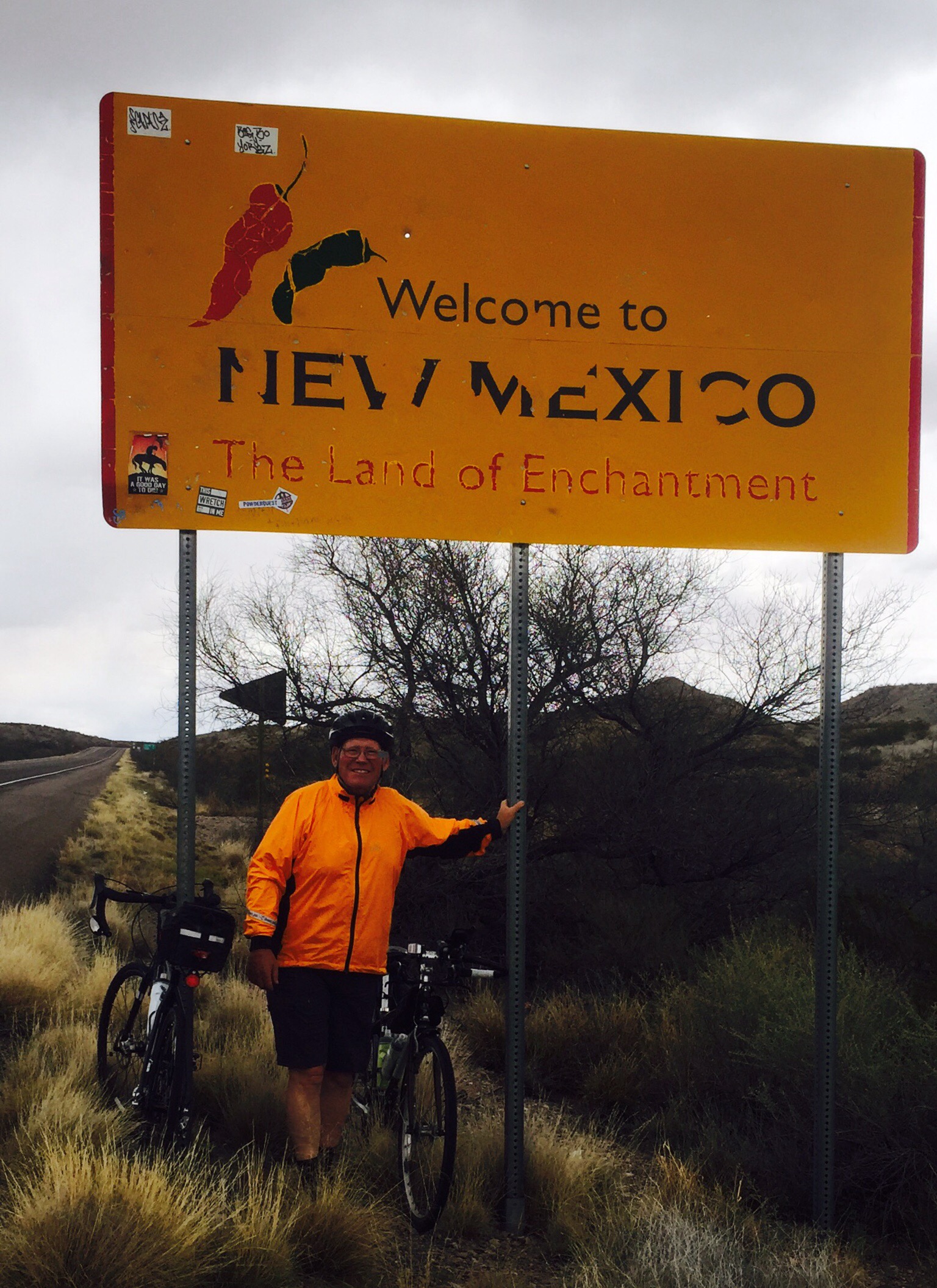 We road almost 75 miles today, with much of it uphill, and I rode my new Trek Touring Bicycle. I dismantled the trike I built at 6:30 am this morning and it is now tied securily to the top of Richard and Mary’s Camper where it will stay until May. We are camped tonight at a KOA campground in Lordsburg, New Mexico, and I am sitting in the laundry room where it is warm and has free WiFi. My shoulder, arm and neck muscles are extremely sore and tired tonight and my butt hurts terribly from my bicycle ride today on a “regular” bike, but I averaged close to 12 mph and the traffic was never an issue. It was sad this morning taking the Duke Trike apart in that it was a fun experiment that I wished had worked. Oh well we can add it the long list of crazy ideas that I have had that haven’t worked. Last night we were at a “Warm Shower” host home and we set up our tent in their backyard. In the middle of the night a cat squeezed in the door of our tent and jumped on Patty, she screamed waking me with a start. We both had a good laugh at the “demon” that had startled us, and then I caught the cat and threw him out of the door of our tent. Today we stopped for a rest, some water, and some snacks about 25 miles into the day. My new bike doesn’t have a kick stand so we usually stop by a sign or road marker and I lean my bike against it. I had gotten some snacks out of the bag on the back of my bicycle, and a few minutes later a truck coming by caused my bike to fall over from their wind. I had my wallet in the top of the bag and when it fell my wallet fell out on the ground and none of us saw it happen. We road 10 miles and stopped for lunch and when I opened the bag on the back of my bike to get my wallet it was not there. I started racking my brain trying to remember where I had put it, and the three of us agreed that it might have fallen out when the bike fell. The ladies were almost to where we were having lunch, so when they got there, Mary Ann drove Patry and I back to where We had stopped. It was going to be such a hassle if I couldn’t find it, but when we got to the spot there it lay, thank You, Lord. Challenges are so much fun to face, solve, and conquer. I can’t wait for what is in store for us tomorrow.