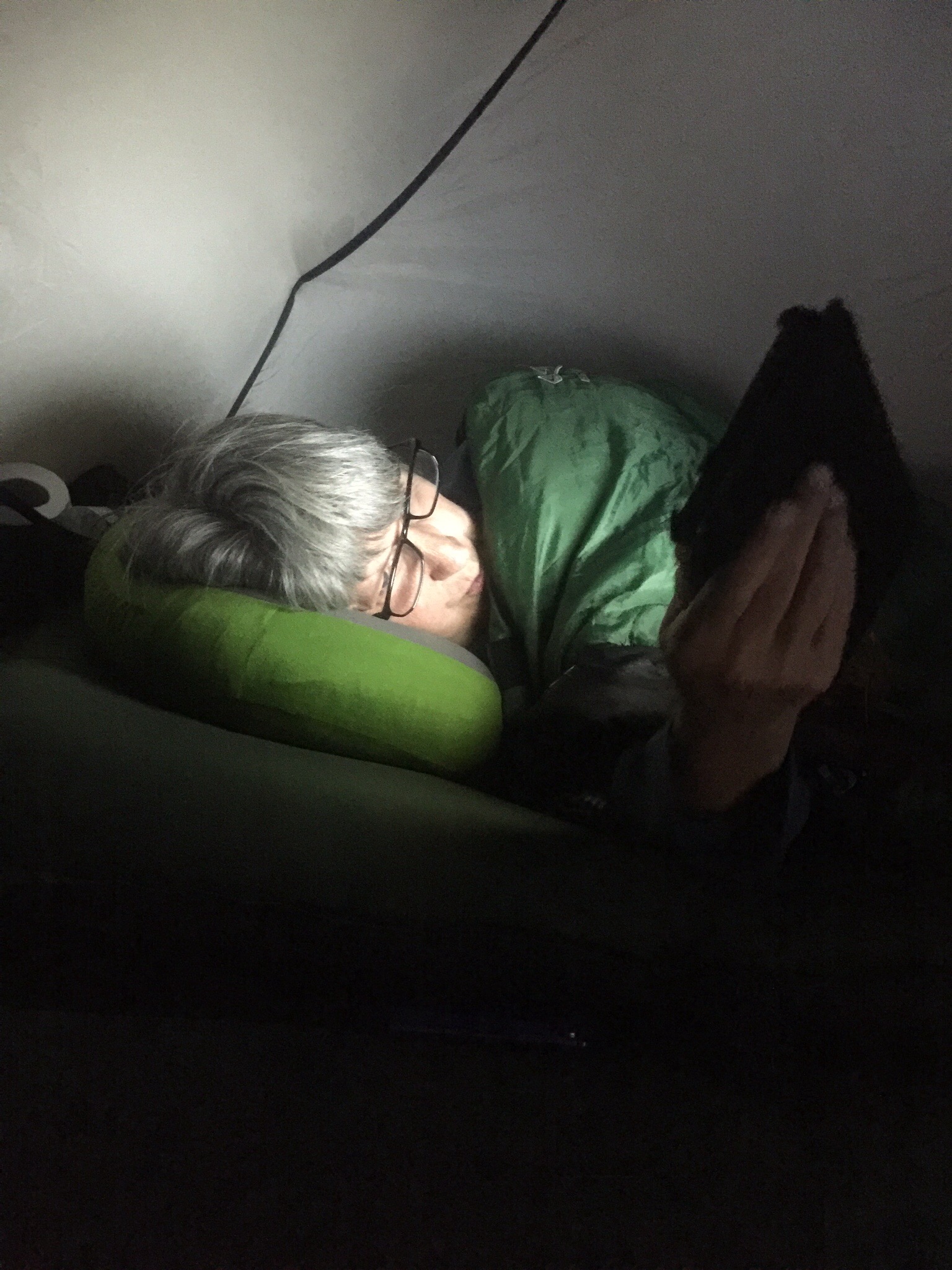 Tenting 2 Replies Patty and I are living in a little 4 person dome tent on our bicycle trip across the nation. Here is a picture of her bundled up in her sleeping bag reading her Kindle. Share this: Click to share on Pinterest (Opens in new window) Pinterest More Click to share on Facebook (Opens in new window) Facebook Like Loading... Related