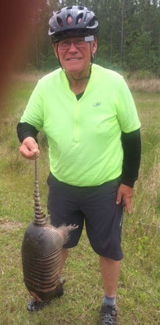 Today we rode our bicycles along the Gulf of Mexico in Mississippi and in Alabama. There was a lot of wind coming off of the water so it was mostly a side wind from the South as we rode East and was a bit of a nuisance but not bad. We saw quite a few Armidillos that had been hit by cars but most were squashed to bad to take a picture of, but this one was in good shape so I drug it out of the road amidst traffic and had John take a picture of us, me and Mr. Armidillo. We rode about 75 miles today and tonight we are camped in the yard of a warm shower host. They fed us dinner of genuine Southern cooking, with collard greens, corn bread, red beans and rice with sausage, and sweet potatoes.