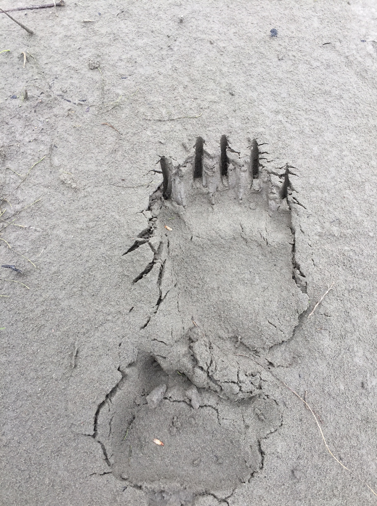 this is a track of the grizzly bear that was around our camp on the Yukon River, while we were moose hunting this past week. We all saw new tracks each day when we went out to hunt, and several times was walking where we had walked earlier. That prompted me to turn around and look behind me while I was hunting, often. Philip had one walk up behind him while he was sitting on a log in the evening. He heard it walking up behind him but when he turned around with his gun ready it stayed in the brush and ran off. I would have loved to have put his hide on my living room wall, though Patty said we didn’t have room for it.