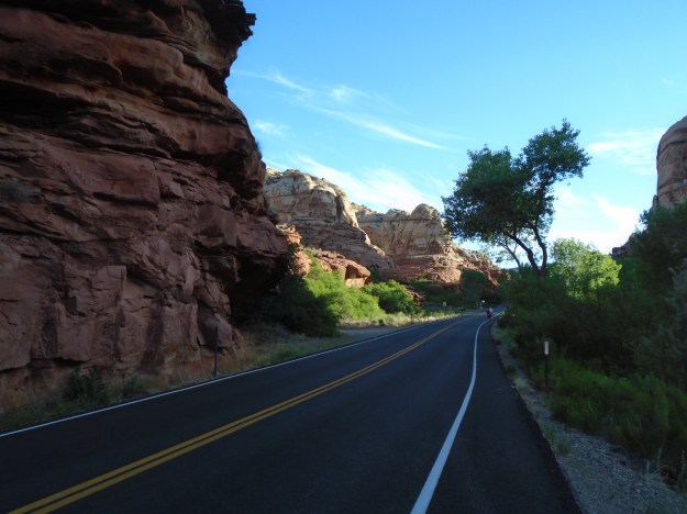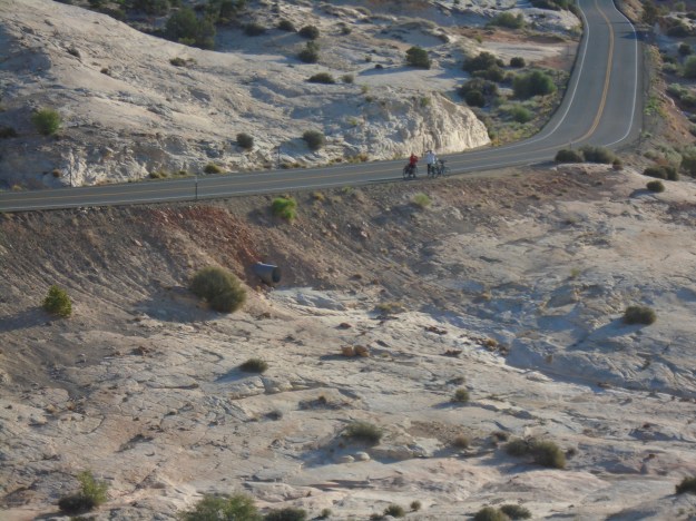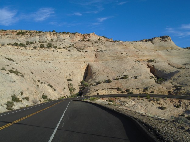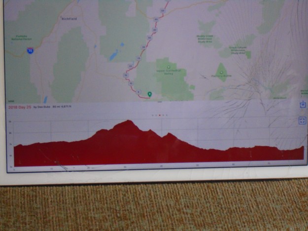 Today we rode 66 miles and we climbed about 5,000 feet up to this pass in the picture at 9,600 feet. This is the new “hardest day” for this trip for me, and also it is the highest pass I have gone over on my Bicycle. When I finally made it to camp after riding for 11 hours I was “toast”. In fact I was pretty sure I was going to fall over dead right after this picture was taken. But instead I rode 26 more miles, mostly down hill,to camp. We are in the town of Torrey, Utah, staying at 1000 Lakes Campground. I am not sure why they call it that because I haven’t seen any lakes.