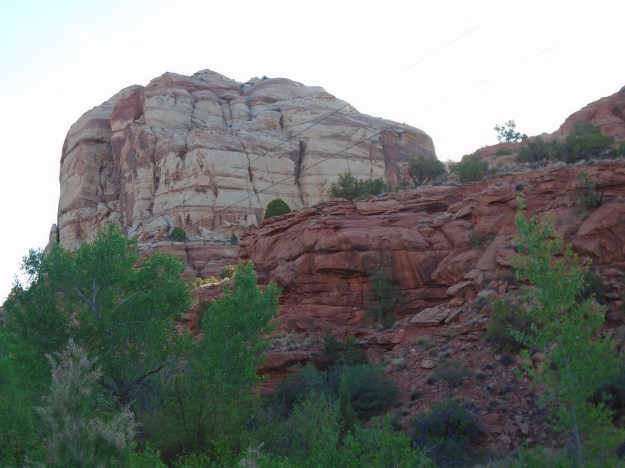 A few pictures from our ride today which was very beautiful. We rode 48 miles that was about half and half up and down. It is a lot work climbing those hills but a great rush going down. Our last down hill lasted for over an hour. It wasn’t super steep, but steep enough so we could cruise along at 15 to 20 mph without pedaling at all. We came from 7,600 feet to 5,600 feet right into camp. One of the uphills was so steep I had to get off and walk, pushing my bike. That is the first time I have had to do that. I walked for over a mile trying to keep from bashing my shin into the pedal that is on the left side of the bike. Tomorrow is going to be a doozy. We are going 67 miles to Torrey and in between is a summit that is 9,500 feet high, that is just under what those who climb Mt Hood do. I hope it isn’t to hot. So far, no flat tires or any kind of bike problems which seems like a miracle considering all that we have had happen in past rides. I am so tired I keep falling asleep while I am writing this. Then I wake up and see that I have 5 lines of jjjjjjjjj’s on my blog where my hand rested on the keyboard.