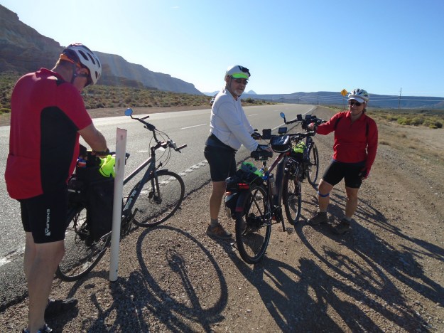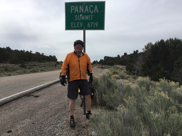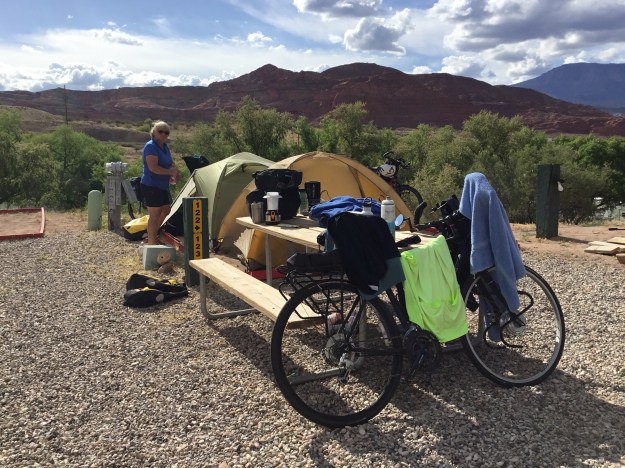 Today takes over first place for the hardest day of riding for the trip even though we only rode 65 miles. We had almost 30 miles of up hill, most very steep, and then when we got to the downhill part we had a huge headwind, and we had to peddle hard to go even downhill. When we got into camp tonight I was totally exhausted. Our daughter Sally, her husband Aaron and their 3 wonderful kids, who live in Hawaii are here on vacation touring this part of the US, and they came by to see me and we went out to dinner together. I was probably awful company as I kept falling asleep. I took my iPad with me this morning in one of my bicycle panniers because the camera on my iPhone doesn’t work and I wanted to get a bunch of great pictures as we get into this beautiful part of our country. Because of the balance issues I have because of Parkinson’s I can’t get started on my bicycle without falling over, it is kind of embarrassing if people are around. To help solve the problem I bought and installed an electric motor that is the front hub of my bicycle. I use it when I start up on the bike by pushing this button that gives me power and gets the bike up to 4 mph very quickly. Once I am up to 4 mph the centrifugal force of the bicycle keeps me up and going. Well, this morning I got into one of the panniers for a bottle of water and inadvertently turned the battery off that powers the motor. I got on the bike and locked my right foot onto the peddle and pushed the button, but nothing happened and before I realized that I had no power and got my shoe disconnected, I fell over flat on the ground. I bruised my right leg pretty good, but the worst thing is I broke my iPad that was in the pannier. I need to get a new one quickly because I do most of my work on it, so Aaron my son-in-law is going to take me shopping for one in the morning in St George, where we are camped.