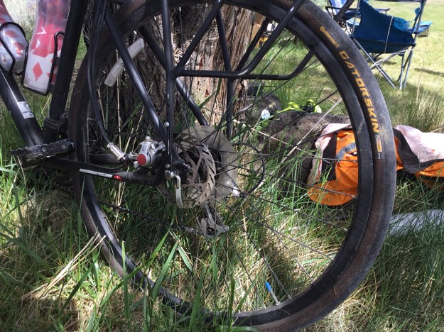 we have been riding through Nevada for several days now and we have 3 more to go before we get into Utah. This is what most of the scenery looks like. It is beautiful in it’s bareness, but it is hard to image anything living in those mountains, but I am sure there are lots of deer, sheep, and probably javelinas as well. We rest on Wednesday’s and Sundays, and in another week we will rest just on Sundays, so today was a rest day. Today I changed my tires, and put on brand new “Gatorskins”. The ones I took off had about 6,000 miles on them without a single flat. I checked and the wear indicators were gone so I thought I better put the new ones on.