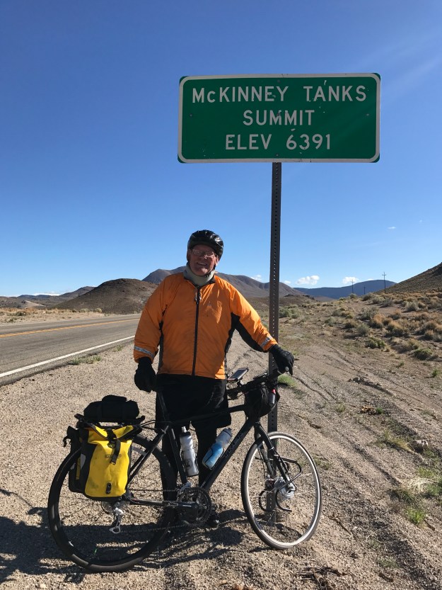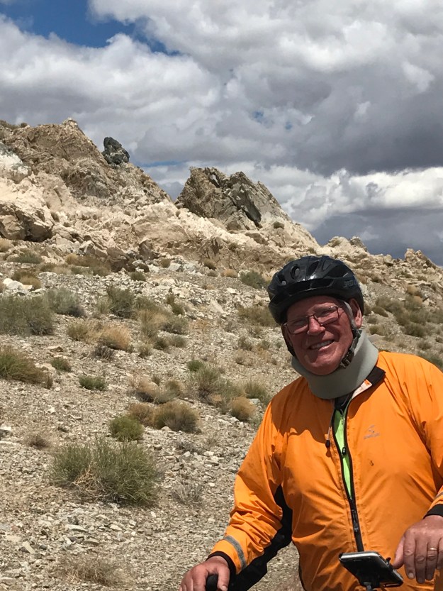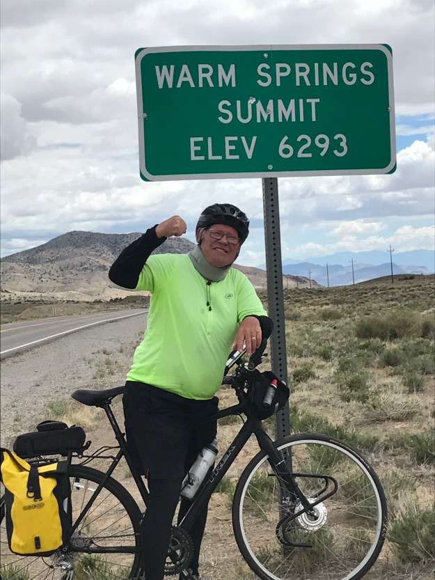 Today I tried a new strategy to deal with the neck pain I have been having as I ride my bicycle, a neck brace which I bought at Walgreens in Reno. We rode 77 miles today and this picture was taken at about mile 60 with virtually no neck pain, that is why I am smiling in the picture. The main negative thing was that my neck was hotter than the surface of the Sun. But a hot neck is an easy trade off for eliminating that neck pain. It was so much more fun today riding with little pain in my neck, butt, hands, legs, and knees. Hopefully the rest of the trip will be as good and even better as I get in better and better shape. It was overcast and very cool when we took off this morning so I didn’t put any sunscreen on, and the sun came out and I forgot all about no sunscreen so tonight My face is feeling as hot as my neck did during the day. As we rode South today in Nevada the terrain was high dessert with lots of sage brush, barren hills, and sand. Today was a major challenge because of rumble strips. They were 12 inches wide with about 12 inches of pavement to ride on between the rumble strip and the dirt. It was so high pressure trying to not veer off in either direction and hit the rumble strips and shake the bike apart or go out in the soft dirt and risk wrecking. There was so much truck traffic that none of us felt comfortable riding on the road side of the rumble strip which put you beyond the white line which will earn you many negative responses from drivers, and also those trucks going by us inches away and about blowing us over in the backwash created. The cool thing about a trip like this is that there are always challenges and problems to solve, just like life.