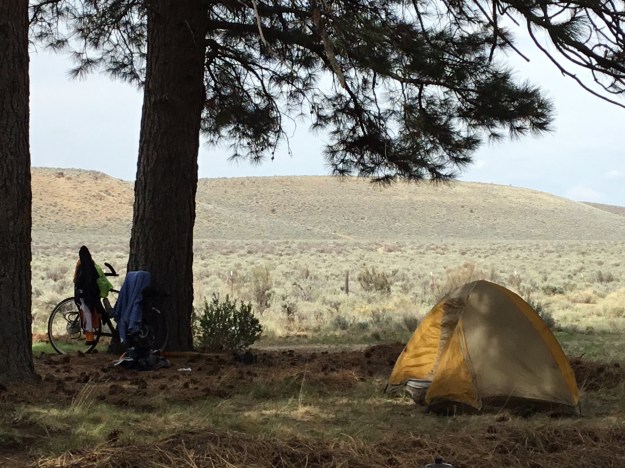 It has been a very nice rest day, catching a 22 lb Mackinaw and then taking several naps and reading and writing a bunch. Tomorrow is going to be a relatively easy day of 62 miles and only 1,495 feet of elevation gain with a maximum grade of 3.3%, a tail wind of about 6 mph with gusts to 20 mph. We will be in a campground near Fort Rock, I think. One of the major challenges on this trip is calling and making arrangements and reservations for the campgrounds ahead. I often don’t have cell service, and it seems regularly that the price they are suggesting is very high for 3 tents and 4 bicycles so I usually do a little discussion on price, usually to no avail. Oh well, still a lot cheaper than what Tom is paying for an RV spot. Part of the problem is that we need to charge cell phones, gps’s, IPad, blinking red tail lights that are very bright and need charging each night, and my camera, so we need a spot with electricity. Tomorrow night is $15 a person and the next night it is $20 per person, but they do have hot springs to sit in. I was hoping to do the entire 60 day trip for $1,000, but it looks like it will be closer to $1,500 if I don’t eat lunch in a restaurant to much. It is a good thing I sold my pickup before we left. It is only 7:00 pm, but I think I am going to go to bed.