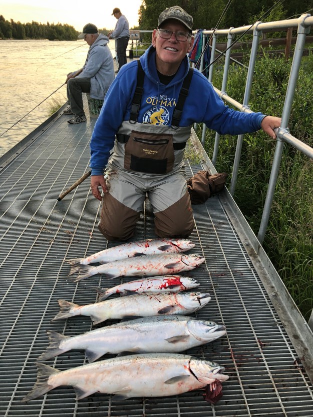 The daily count for Sockeye Salmon on the Kenai River jumped up to over 70,000 fish yesterday which made the fishing very hot. We started last night at 9:00 pm and fished until 3:30 am and most everyone limited out with 3 salmon, and then 2 of us went again at 4:00 am this morning and limited out again. The rest went again from 11:00 am until 5:00 pm and limited as well. We vacuum pack the fillets and put them in the freezer, and the goal is that everyone takes a 50 lb fish box home with them on the airplane. The reason we fish from 9:00 pm through 3:00 am because there are very few other people who fish then so we don’t have to put up with the craziness of people. When a whole bunch of people show up because of the big fish numbers the term “combat fishing” takes on a whole new meaning. Many of the people are from Mississippi, Oklahoma, Germany, Sweden, Japan to experience the famous Kenai River. Very few of them know how to fish so they fish for hours and catch no fish even though there are thousands in the river. One of my favorite sports is people watching while fishing amongst them, and talking with them and watching as they attempt to catch a fish. It prompts lots of prayer from me for those I see that God will work in their life. I sing quite a bit while fishing, loudly, mostly “Jesus loves me” and I get a lot of “looks”. I had a great conversation with a guy while cleaning fish today about the church and Jesus. It didn’t go anywhere but it was fun talking about my faith to a person who didn’t have any.