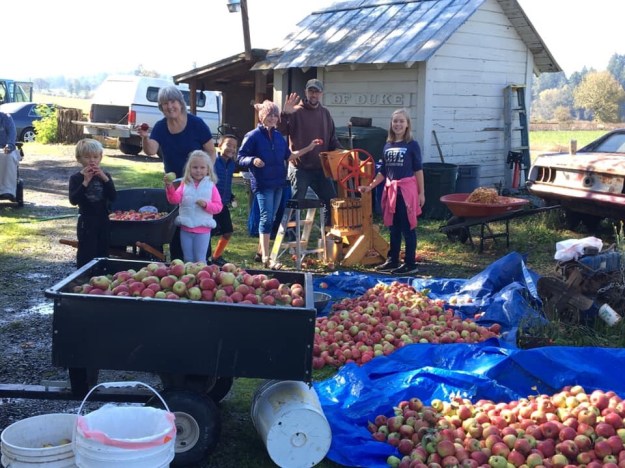 today we had a big family project of picking our apples and grinding and squeezing them into apple cider. We had 5 of our kids, their spouses and 14 grandkids here, it was a blast. We finished the day with 30 gallons and probably another 5 that was drunk during the day. Over the years that we were raising our 8 kids we usually kept them home from school most Mondays and had a family work day. We did all kinds of projects like making apple cider, cleaning up the place and going to the dump, cutting and stacking firewood, painting, cleaning the house, weeding in the garden, and on the list goes. Our goal was to teach the kids to enjoy working, to work hard, to work together with others in unity, and just to be together as a family doing something productive together. Those family work days are some of my best memories of our kids when they were home, and today was a blessed time of reliving the good old days.