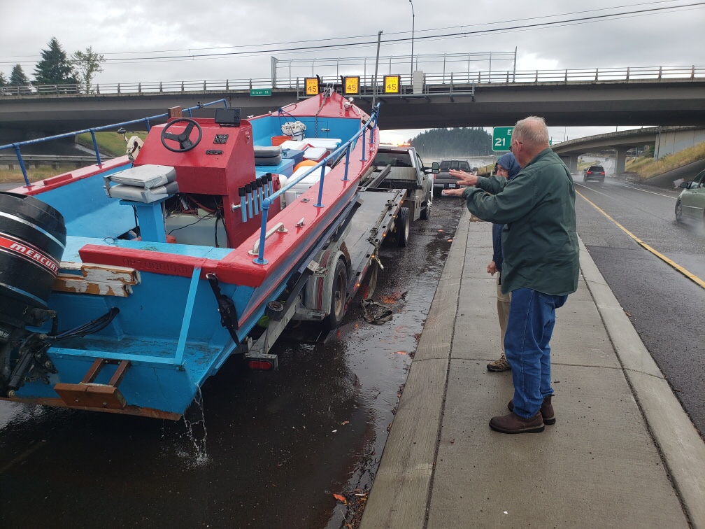 Myself and three friends left at 1 pm for Huntington, Oregon and the Snake River to go catfish fishing. We were towing my boat, and in Portland a wheel bearing went out. We waited in my pickup for 3 hours for the tow truck to get there. He finally made it and he took the boat and trailer back to my house. We drove back and ate a great dinner that Patty fixed us, and now we are back on the road just about where we had to turn around earlier. We decided to fish with two other friends who left before us with a pontoon boat. We can only fish four at a time on the pontoon boat but we can rotate. It should be a great fishing trip as good as it has started. The picture is of the boat and trailer getting loaded on the truck, it barely fit.