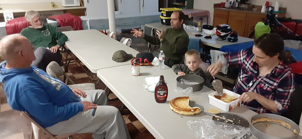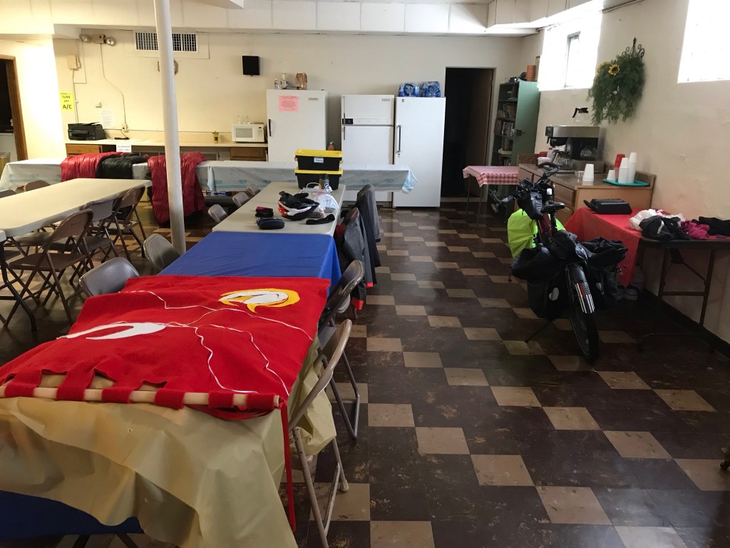 The basement of the Luthern Church. They had bathrooms, power, a kitchen, and plenty of room for pads and sleeping bags.Eddie and Jennifer DeHaven came to visit with cheesecake and great topping.Flat tire. I have only had two so far. Piece of broken glass was the culprit.Somebody is taking my picture! I growled at them.