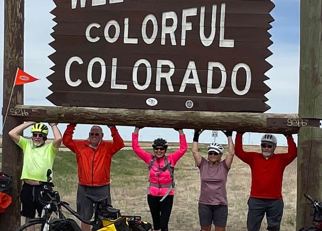 Tomorrow we have an easy day, 56 miles and mostly flat. Hopefully, there is not a big headwind. A fellow we talked to today said every other day lately was big wind days, up to 50 mph. The wind today was coming straight out of the north and we were traveling straight West, so we had a side wind, which wasnât much of a problem for us. We crossed into Colorado today and got a picture with the âWelcome to Coloradoâ sign, and because we didnât get an âEntering Kansasâ picture when we came into Kansas we turned around and got one on the other side of the road.