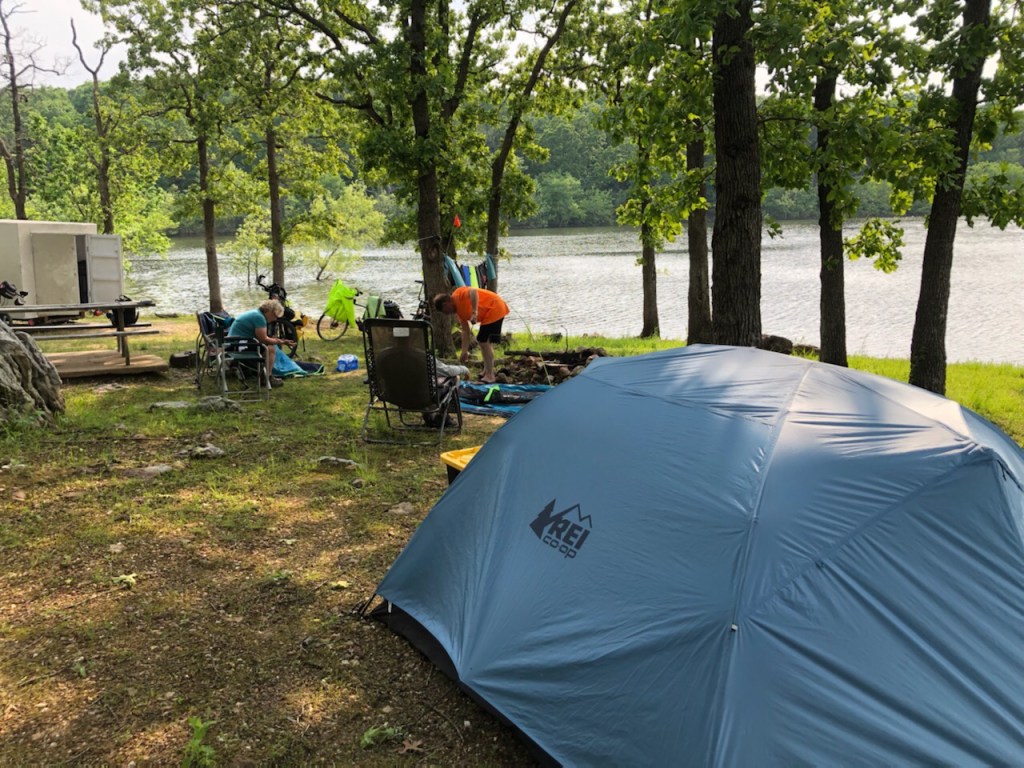 We had another doozy of a thunder, lightening, wind, and torrential rain storm last night and today. When you are tent camping heavy rainfall is not fun. Tonight we hung tents out to dry now that the rain has stopped and after we got them set up we sprayed the rain flys with silicone waterproofing. Whenever Patty went with me on a bicycle trip we would rent a motel room for the night if it was raining, and we almost did tonight, but we went the cheap route in that the campground spot was $10 for the night for all of us.