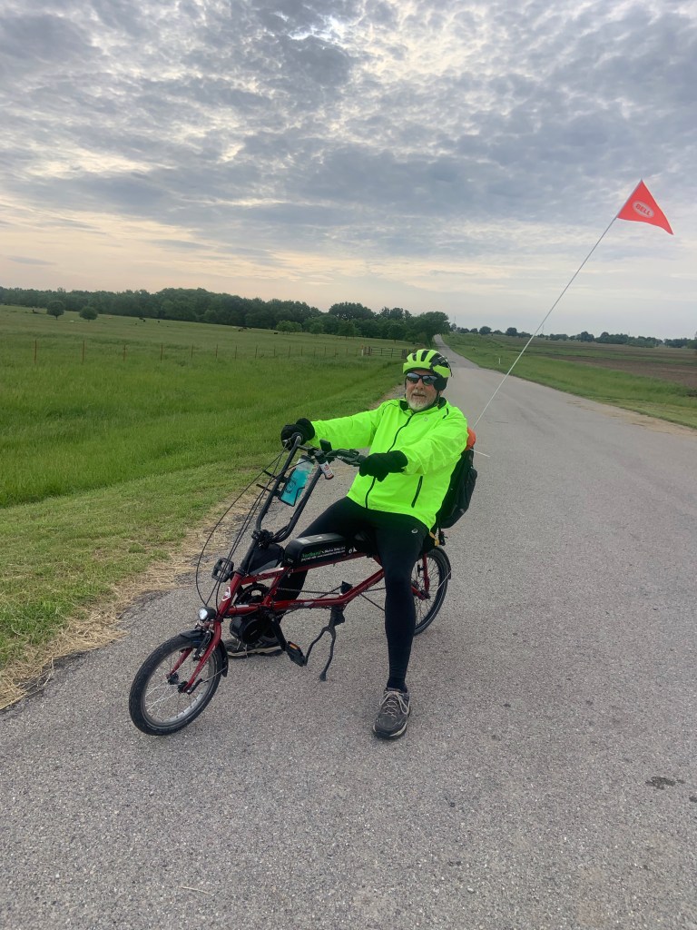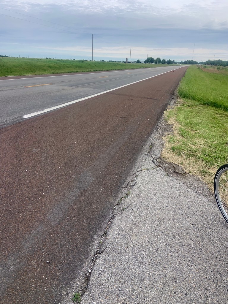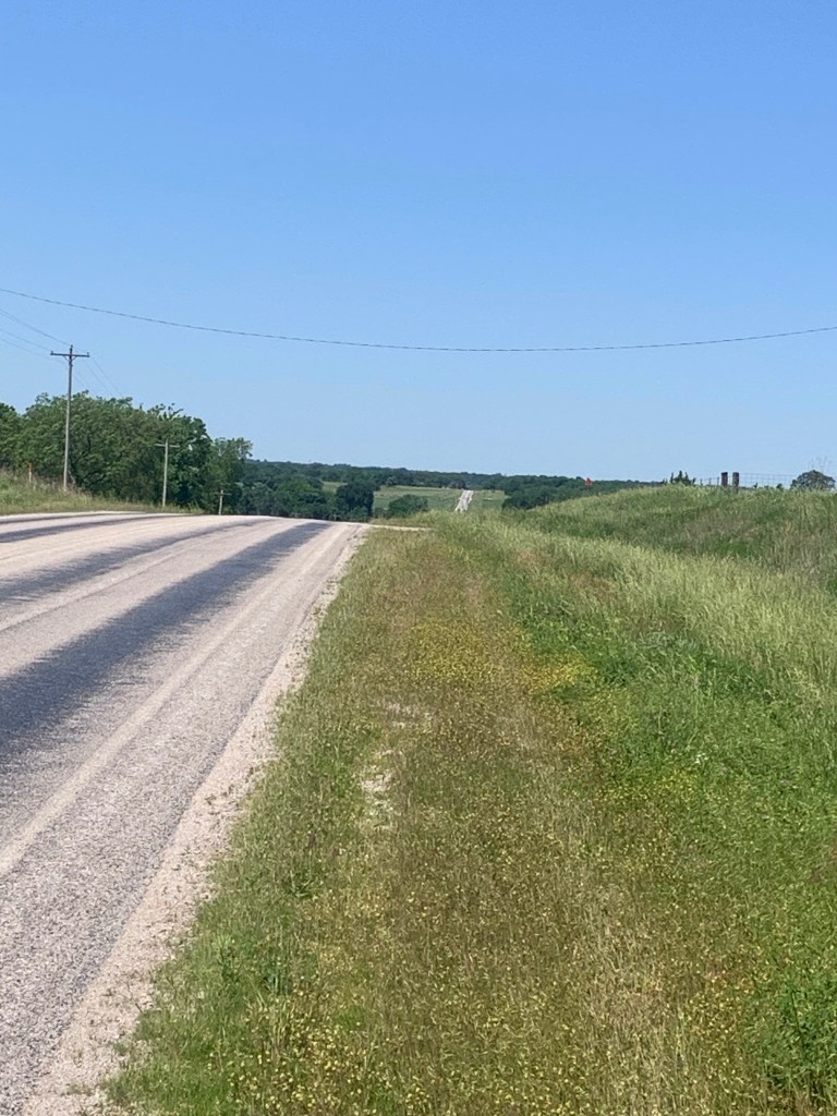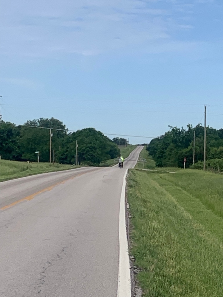 The steepest hill that I went up yesterday, Sunday. A Kansas Mountain!We biked on this road for 35 miles and it was straight as a string the entire time.Occasionally we get to ride on a road like this with three-foot shoulders and no rumble strips, so nice!Tom Zilverberg on his new recumbent bike. Way more comfortable seat because your legs are out in front of you when peddling, and lots of push power with your back supported so hill climbing is a breeze but he struggles to keep up with us on the flats. He still has some issues with the back brakes but we are gradually getting the bugs worked out.Off Cliff and Kathy go ahead of me.
