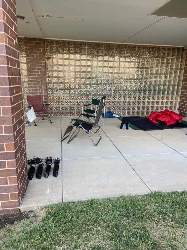 We are camping in a porch area of a sports complex which is handy because we donât need to set up tents. I was to tired to do much for dinner so I ate two cans of sardines. We are in Hoisington, Kansas tonight.