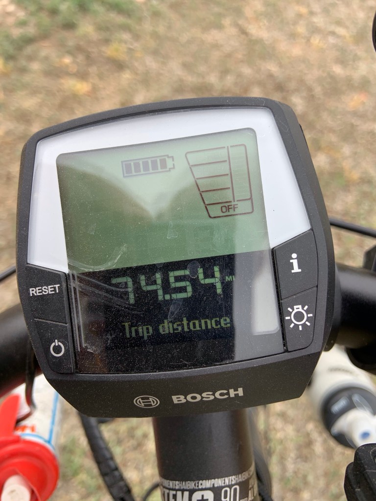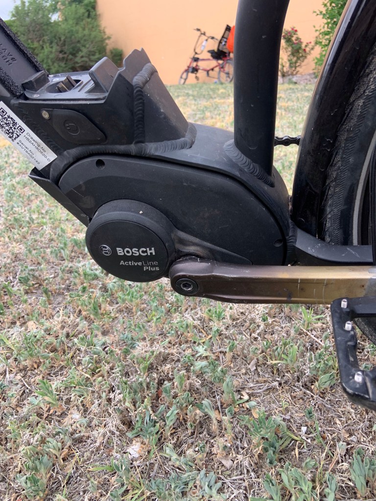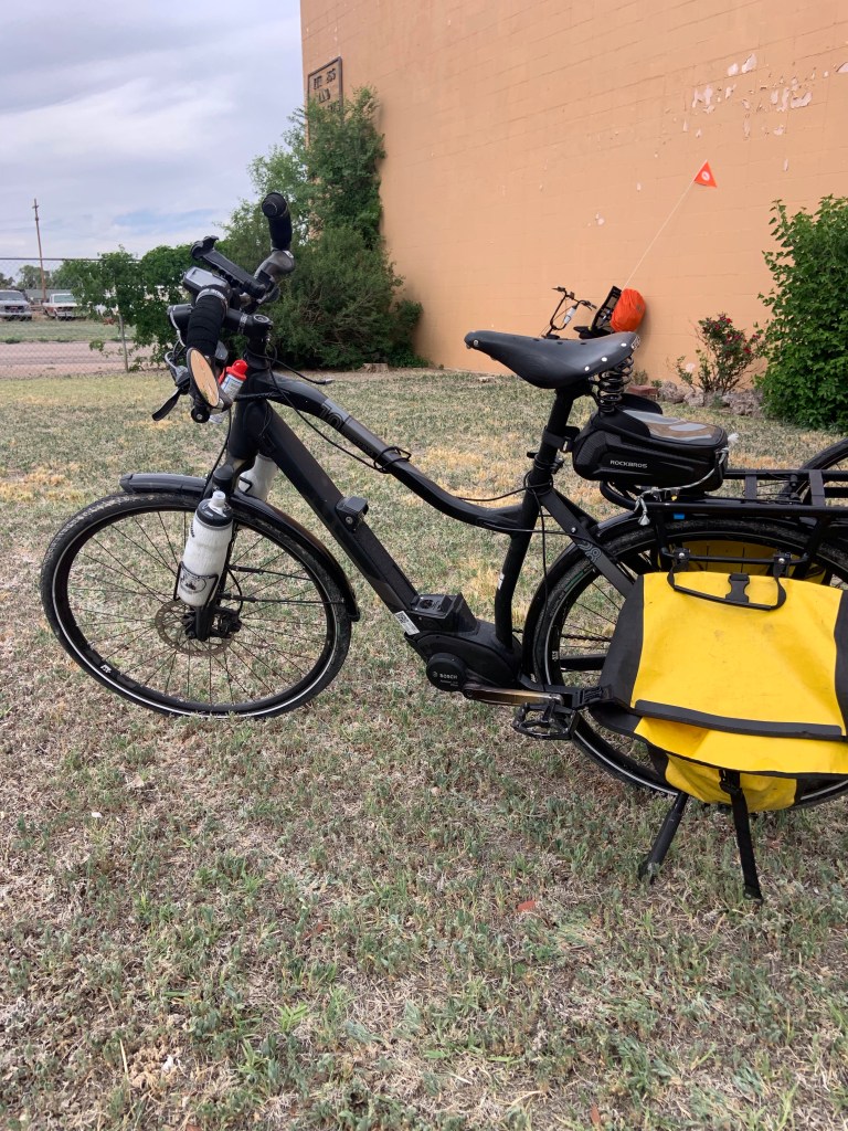 There she is, beautiful donât you think! Notice the almost âgirlâs bikeâ look with the center bar being recessed. That is so I can stand up with both feet on the ground when I stop and start. Because I am so stiff and rigid I canât get my leg over the bike when I want to get on and off, so I lay the bike down, step over it straddling it and then pick the bike up under me, and I do just the opposite when I get off, lay the bike down, step over it, and then pick it up and put the kick stand down. Watch the video at the end of the pictures.The brand of my bike is a âHaibikeâ made in Germany.There are a number of different kinds of âHaibikesâ depending on what you plan on doing with your bike. This one is made for long distance touring and is called âTrekking 1.0.â Touring bikes are made for comfort not for speed so they are built much stronger and heavier. When I take a tour without a support vehicle I am carrying an additional 70 pounds in my panniers besides my own 220 pounds.This picture shows the size of the bars and the welds making it very durable and comfortable.My bike is what is called an e-bike. I have an electric motor on the bike that helps me out. It is pretty sophisticated in how it works. There are devices on the bike that sense the amount of pressure on the pedals as well as rpm’s that I am pedaling and the gear that I am in and gives me electricity accordingly. The harder I push because I am going up a steep hill the more help I get. When I am on flat ground and cruising along at 18 mph with little effort the motor isnât running. I have two batteries and I need to conserve my power so as not to run out. Though whener it is flat, down hill or we have a tail wind I turn the motor off. I am sure that my bicycling would be over because of my parkinsonâs if it werenât for this cool invention. Even though it helps I still work hard, sweat a lot, and keep my heart rate at 120 bpm most of the day.This is the brain for my bike. At the top, you can see the tube-shaped thing. There are five bars in it, and as the battery is drained, the bars go down in number. My bike has four power levels, and you can see the four boxes over the word âoff.â Most of the day I have it in âEcono â level which would be in the first box, then there is âtourâ which I switch to on extra steep hills, then âsportâ which I will switch to ten miles from camp if I have a lot of battery left so I can beat Cliff, and then there is âTurboâ which I use to run away from dogs. I only takes about 30 minutes on âTurboâand your battery is empty. The computer also keeps track of everything in a days riding and for the whole trip. Total mileage, average speed, fastest speed, feet climbed, and feet going downhill. I assume it uses GPS on the last two numbers.My seat or saddle is an all leather âBrooksâ. It appears to be hard but over about 400 miles the leather stretches to fit my butt so it is relatively comfortable. Also smooth leather creates considerably less friction between the inside of my legs and the seat. Friction is your worst enemy on a bicycle seat.