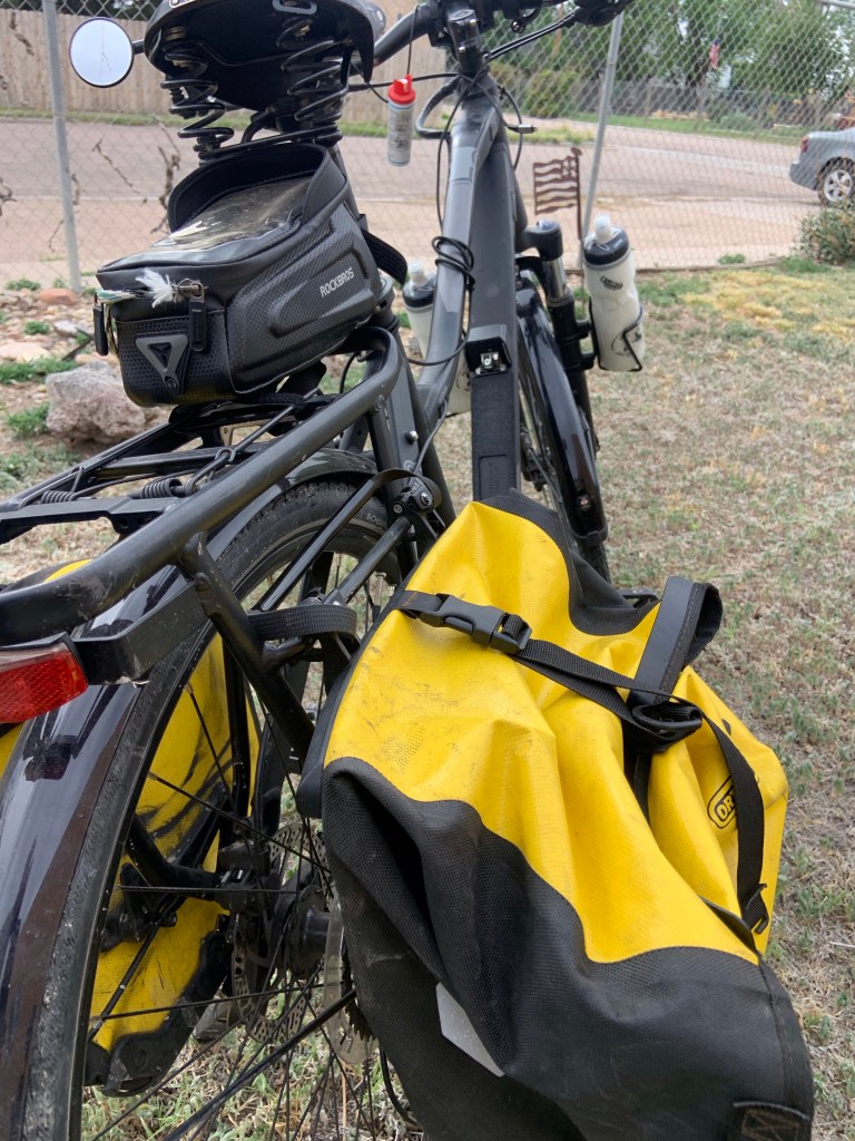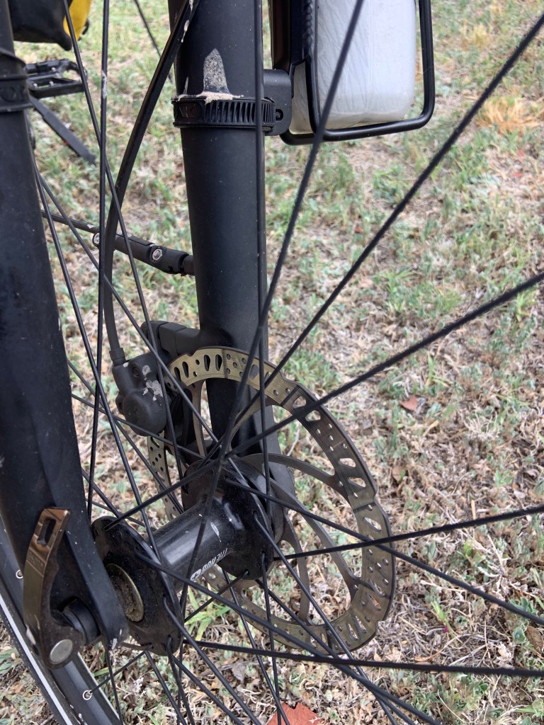 These are disc brakes and they are also hydraulic instead of manual so there is plenty of stopping power when you are going down a steep hill with lots of weight on the bike.One of my favorite things about this bike is the shocks on the front wheel. On every bike trip I have taken one of the worst things for me is the excruciating neck pain that I would get. A lot of back roads are âchip and sealâ so they are rough. That roughness goes from the front tire up to the handle bars which I am leaning on, up my arms into my shoulders and then into my neck. I would take lots of ibuprofen and rub my neck with lots of liniment every night. With these shocks I have had minor arm, shoulder, and neck problems or fatigue. To say I love these shocks would be an understatement.These are the panniers. I also have some for the front. Because we have a support vehicle on this trip I just have rain cloths, 6 extra water bottles, tools for changing a tire, snacks for when I get hungry, and my extra battery in these bags.