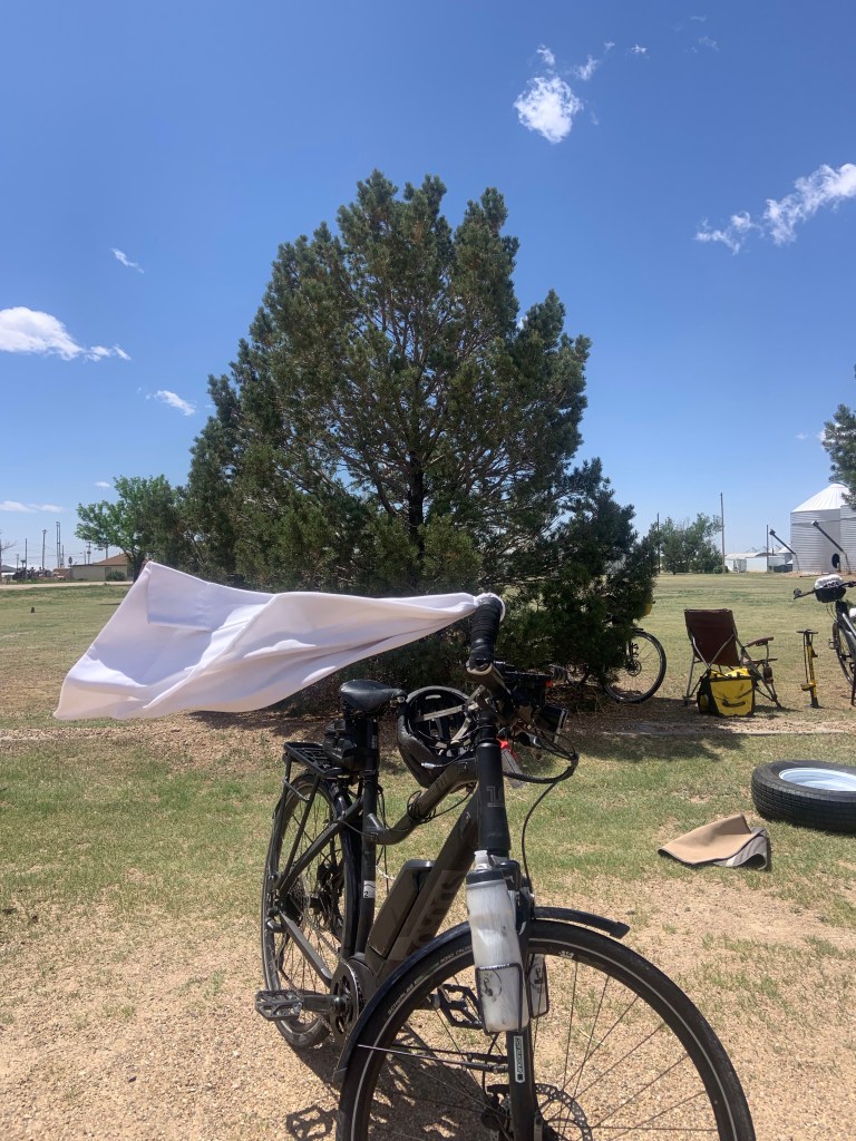 The forecast for tomorrow is for more of the same so we are going to try and get left at 5:30 am for two reasons. The first is to get as many miles as possible done before the wind starts. We leave camp and head straight South for 25 miles so we want to get that part done early for sure. The second reason is that it is supposed to be 100 degrees by 2:00 pm Our route and destination tomorrow calls for a 90 mile day but I am going to quit at 62 miles and Dave is going to pick me up, a semi-rest day. The others may as well, but they are waiting until they ride for awhile before deciding.