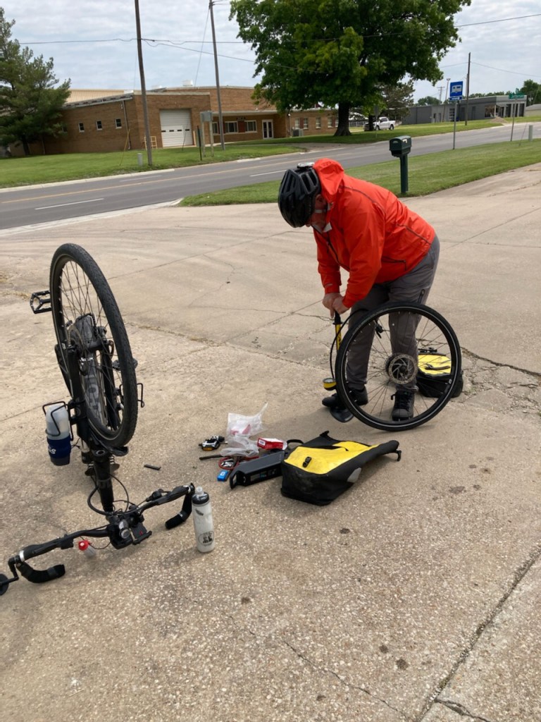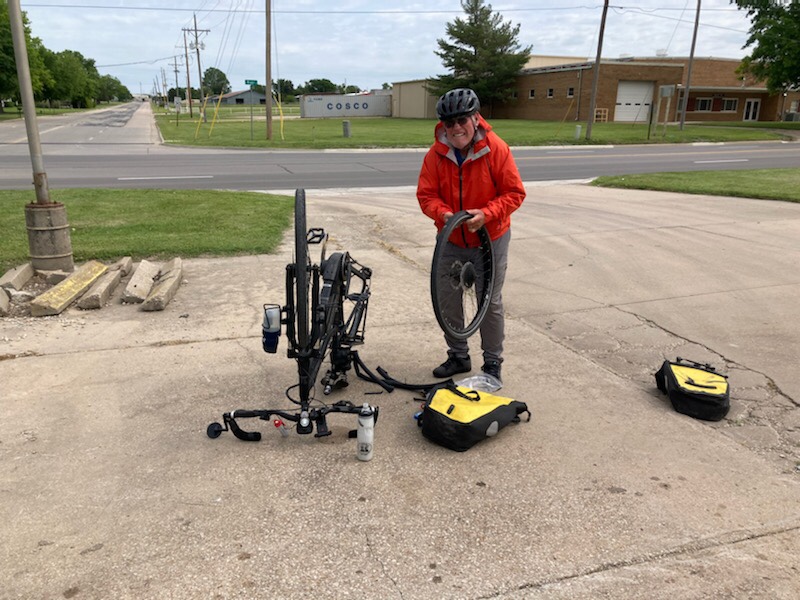 There is a bike shop here in Pittsburg, and Tom was able to get the broken rim on his bike fixed. We are making guesses on who’s bike will be the next one to break down. So far, we have traveled 1,663 miles on our bicycles. Because of bicycle problems, my total miles biked is 1,482. As I predicted, I was sore in a multitude of places because of my gravel wreck yesterday, but I expect that all will be normal tomorrow.