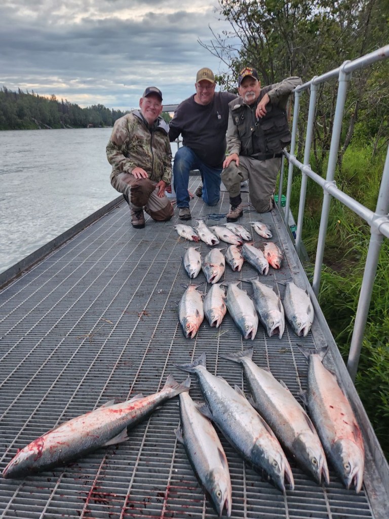 Last night the Sockeye run started. The sonar fish counter had a daily count from July 1st of about 5,000 fish a day, which is very low which means catching one fish will take most of the day. Yesterday’s count was over 20,000 fish. Five of us went down to the Kenai River last night at 7:00 pm and by 10:00 pm we had our limit of 15 salmon.