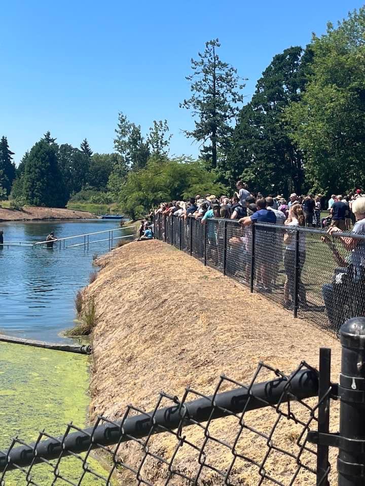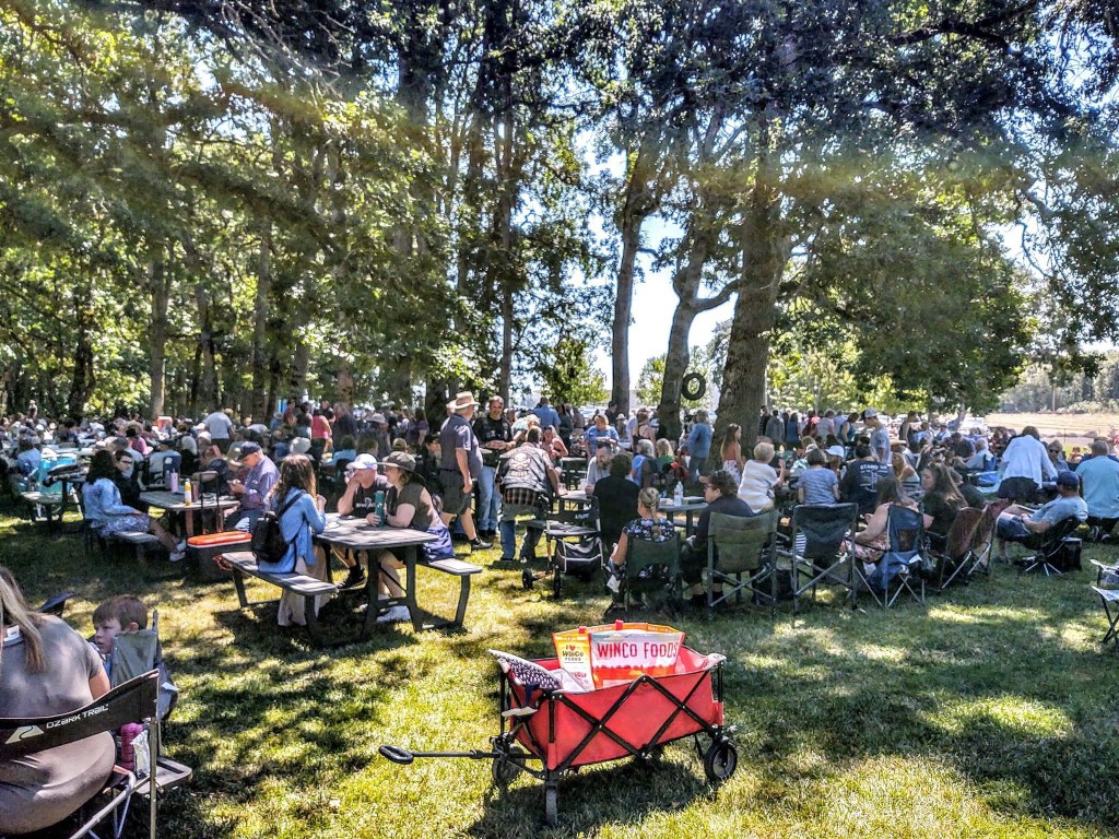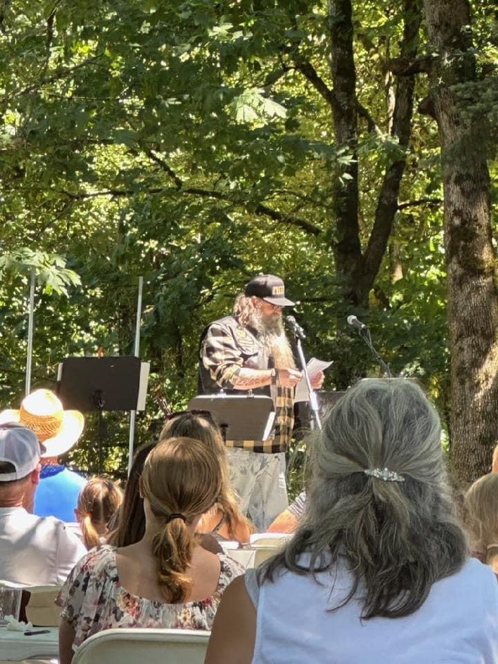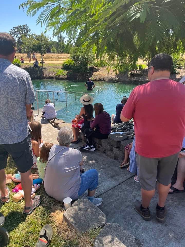 Sunday was our annual “Baptism at the Lake” service. We meet at a park-like location that a retired farmer in our area owns and maintains as a ministry for churches and other groups. It is a gorgeous place with lots of well-maintained green grass, many oak and fir trees for shade, water, electricity, port-a-potties, and a beautiful lake called “Lake Charles.” We don’t have any other services that weekend. It starts with a big “Potluck” at noon with great food and fellowship. Then it moves to a worship service, with those getting baptized sharing a testimony of their story with Jesus intermixed with singing. And then we all move to the bank of the lake where a concrete platform has been built in the water, just the right height, with a guard rail and a walkway out to it.
