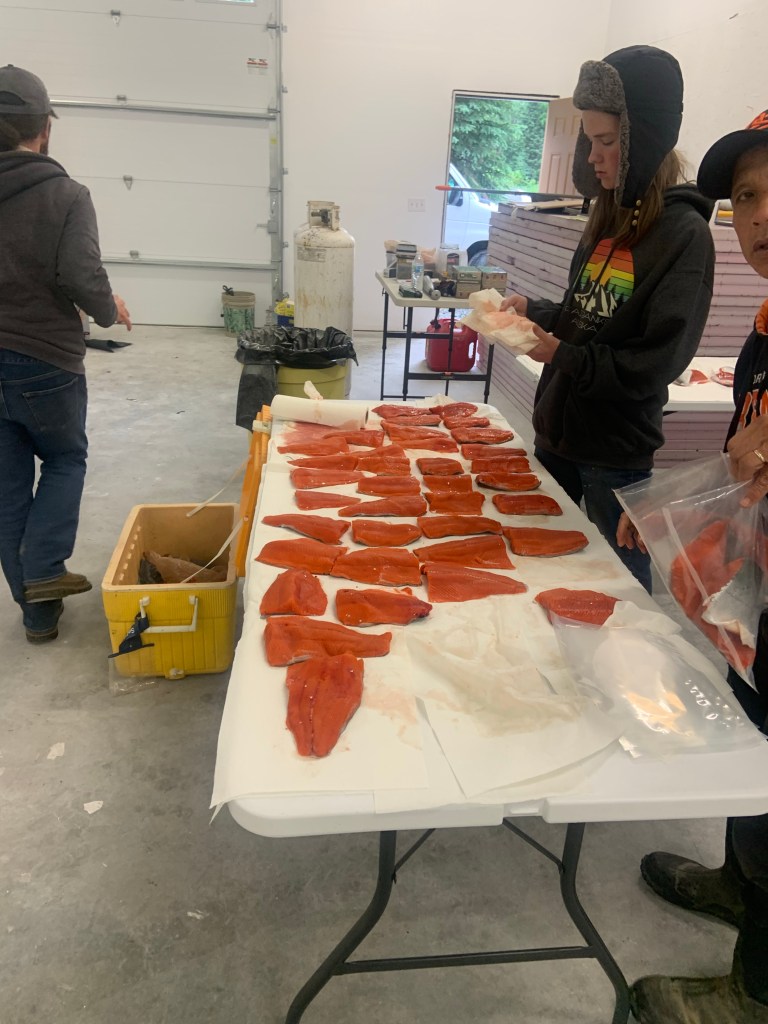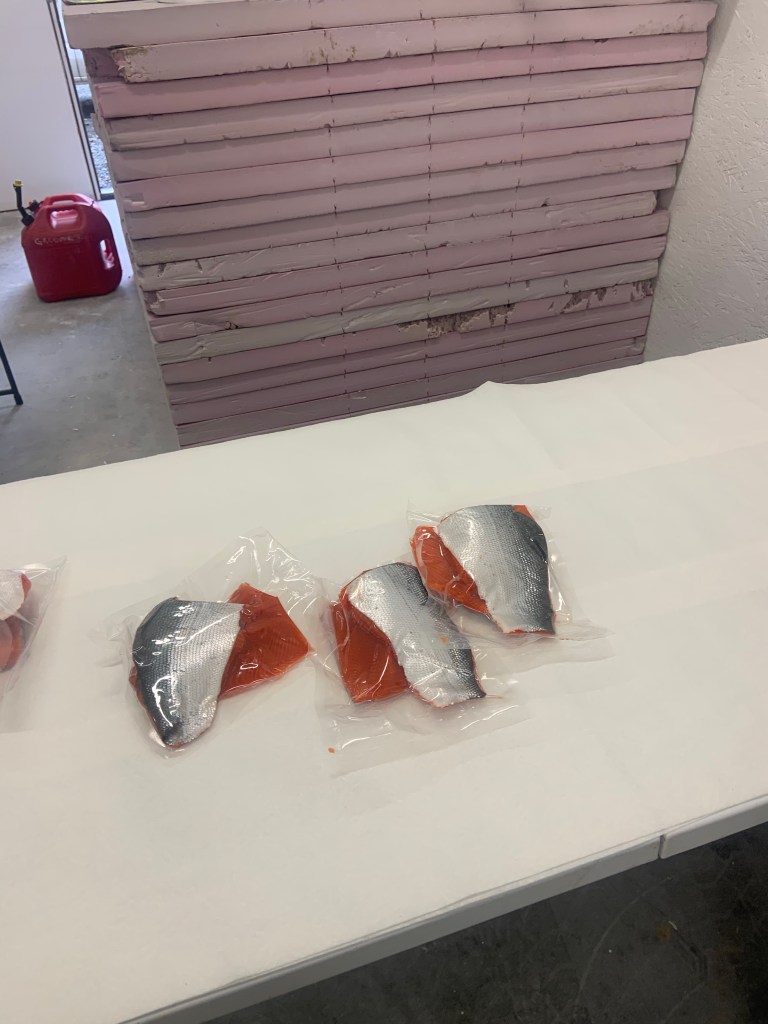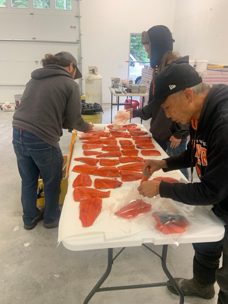 This is the salmon processing where we pat them dry with paper towels then we put them in bags and vacuum pack them and put them in the freezer soon to be brought home in fifty pound fish boxes on the airplane.