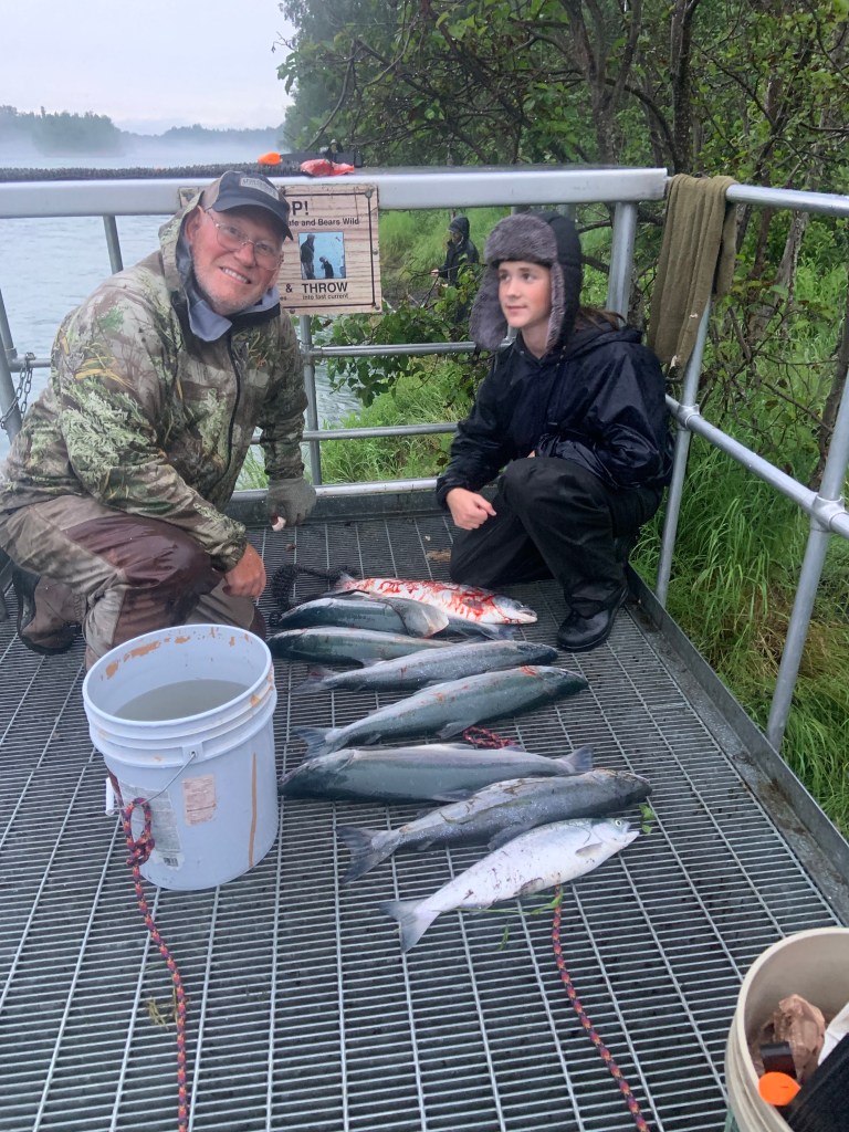 There are a lot of things that I enjoy doing by myself, but fishing, probably my favorite activity in life, I enjoy doing with friends and family. Not all of my good friends enjoy fishing, nor do all of my family. I don’t remember ever fishing with Patty, but she certainly is my favorite person to do many other things with. Probably the most enjoyable thing that I did with my Dad was fishing. I fish regularly and often now with many of my friends and family. On this trip that I am now on in Alaska my son-in-law, Luke and his son, my grandson Will is with me. Neither of them has fished a lot in their past so I am enjoying teaching them the skill and the joy of fishing. Here is a great picture of Will and I yesterday and also one from eleven years ago with my son Seth, two other friends and their sons.