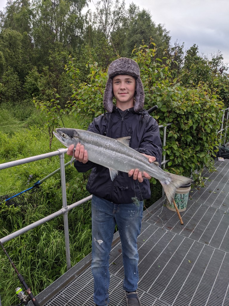 My grandson Will Doughton is here with my son-in-law Luke Doughton, his dad, and he caught his first sockeye salmon. He also hooked into a big King salmon that took all the line off of his reel before any of us around him noticed until it was too late, which ended his fishing for the night. We sat around in the cabin telling fish stories until well beyond midnight last night and slept in this morning. We will go out again tonight for some more hot fishing.
