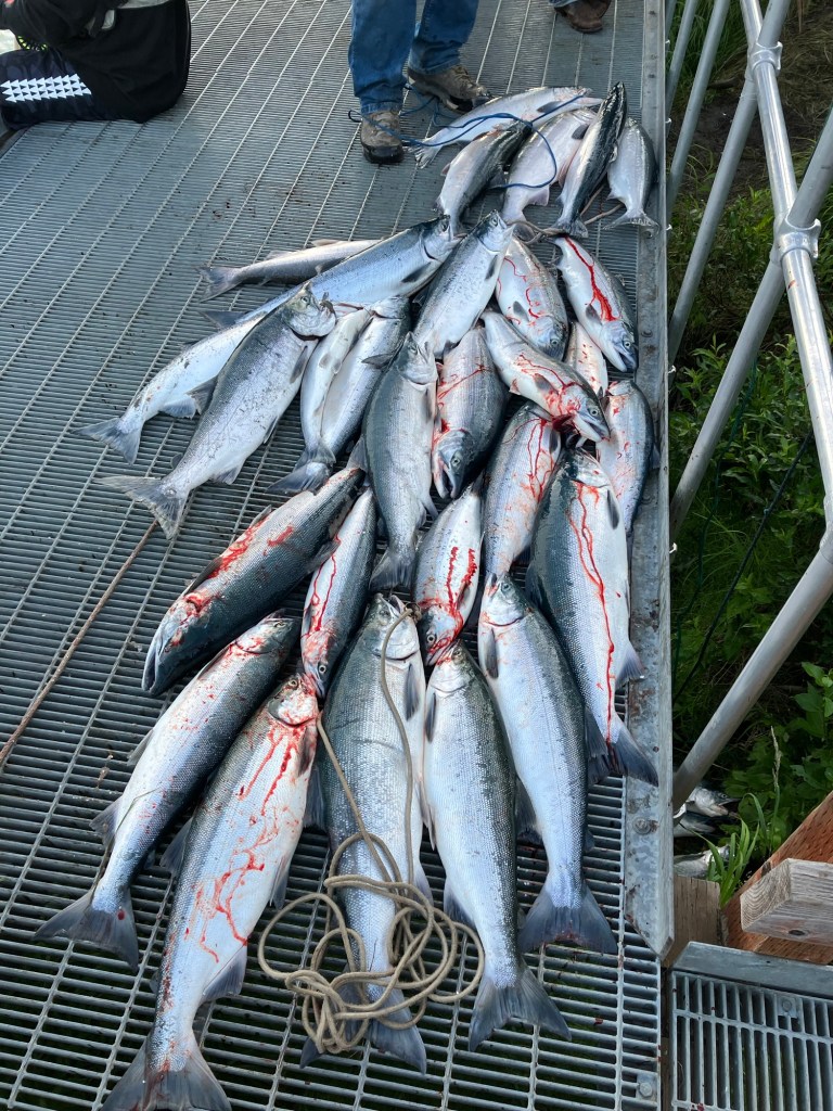 While in Alaska fishing for sockeye salmon on the Kenai River, we fish on docks built out over the river. The city of Soldotna has built over a mile of them. The reason was to prevent people from tearing up the banks of the river as they climbed into and out of the water, causing erosion. They are about three feet above the river and are very nice to fish off of, especially for old guys. You can note what they look like in the picture.